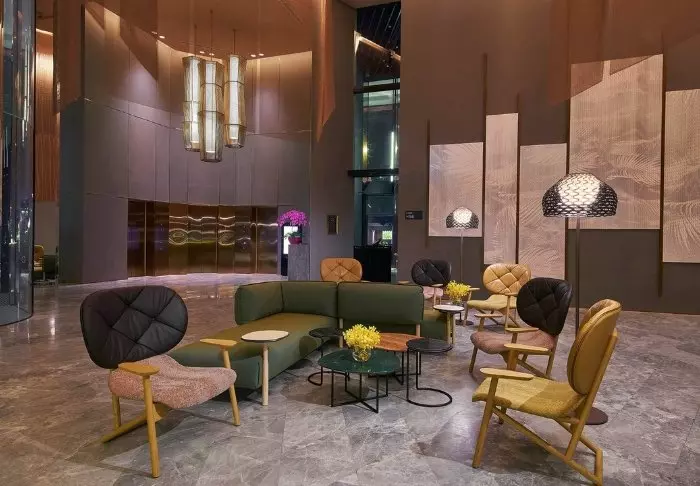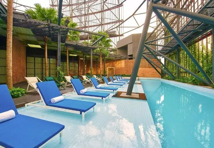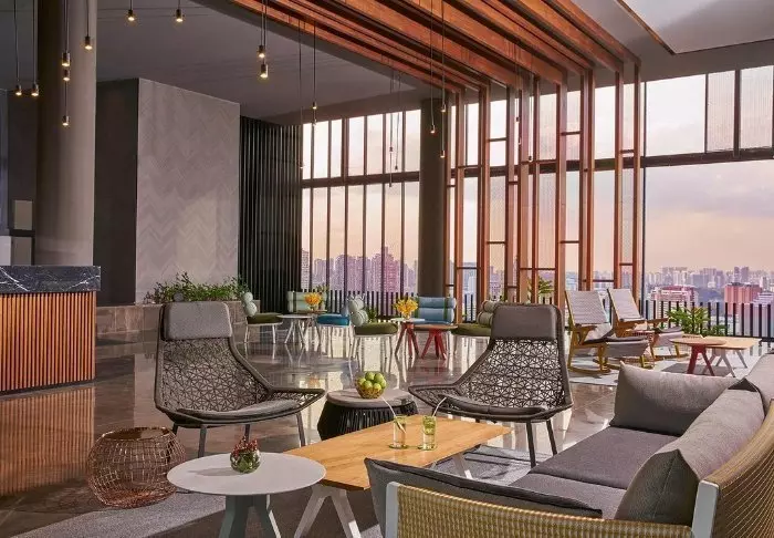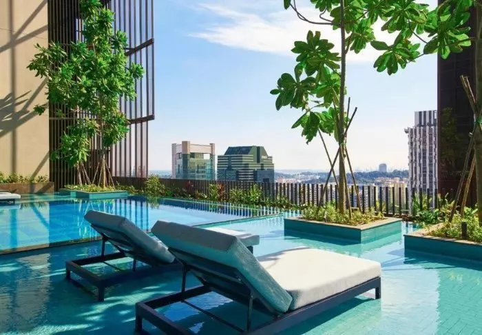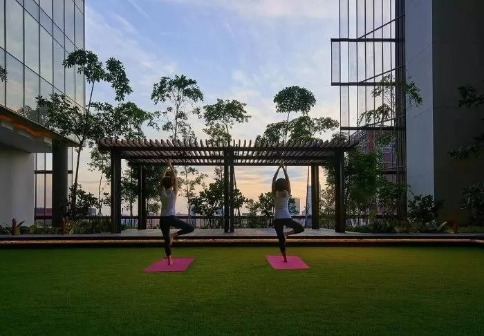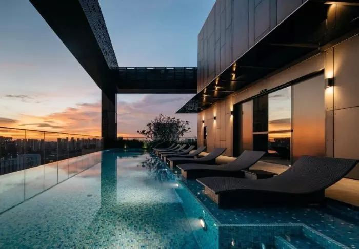 And it’s not only from the outside that you’ll note its spectacular way of embracing nature in the middle of the big city. On the 27th floor, you’ll find the roof terrace, adorned with 21 different types of creepers and vines, where you have every opportunity to relax on a sun lounger next to one of the two pools. A few floors further down, you’ll find another terrace, which looks like a lush oasis. Bring a good book with you and sit yourself down in their lounge area or dig out your gym wear and work out on the green lawned area while enjoying the fantastic view. You can also make use of their gym, which is open around the clock.