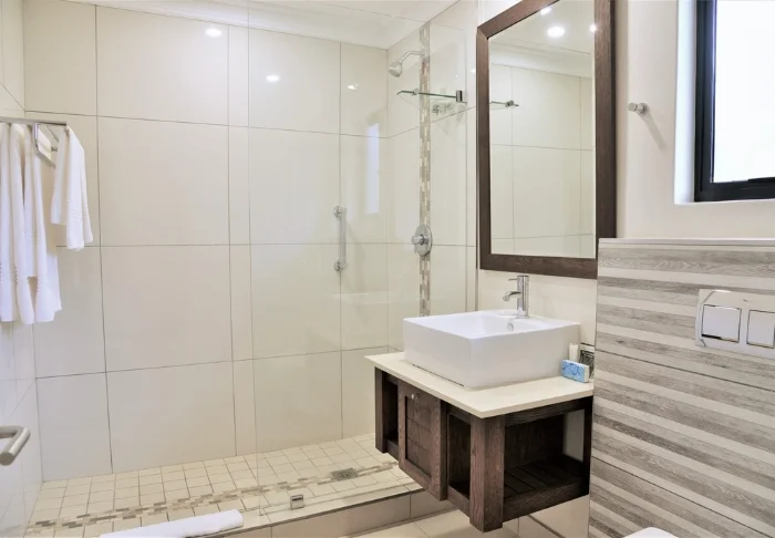 The hotel has 173 rooms, all with large floor-to-ceiling windows and views of the Indian Ocean. The rooms are modernly appointed in bright, welcoming colours, with the bathroom as an integral part of the room itself. There is free Wi-Fi in all rooms, as well as a fridge, safe and tea and coffee making facilities.