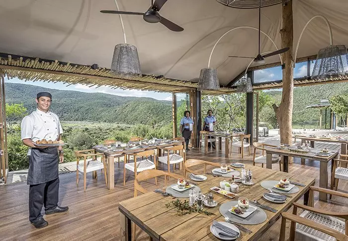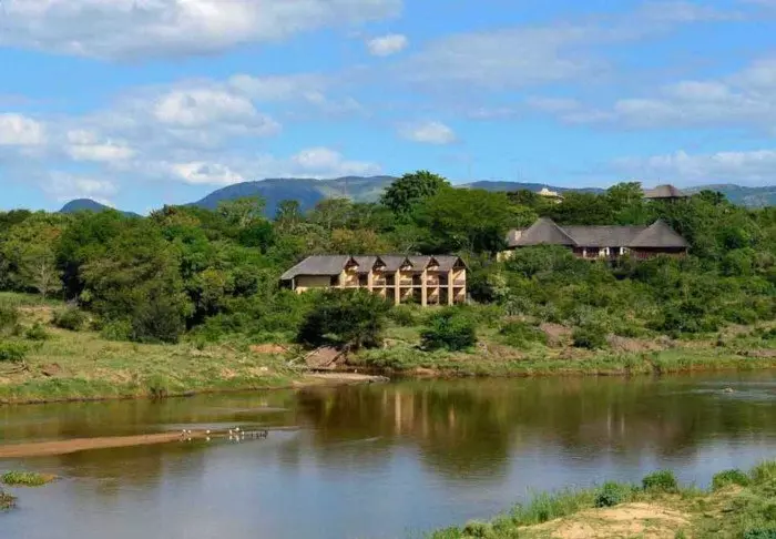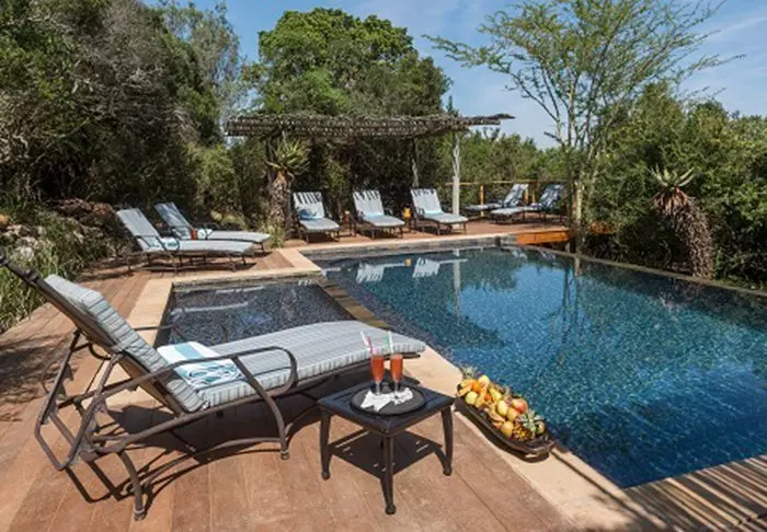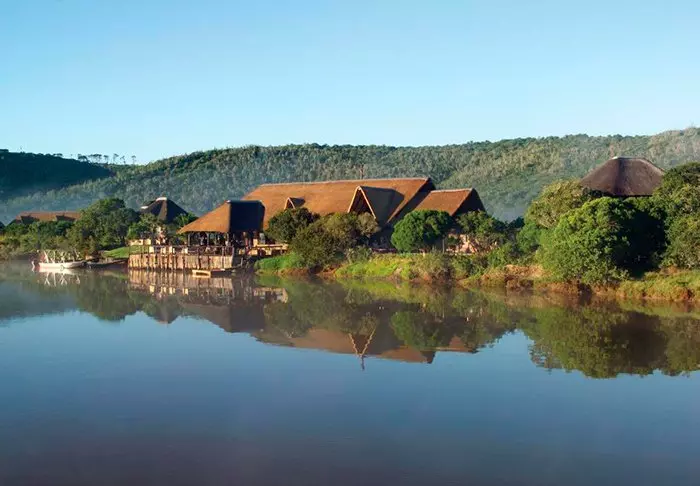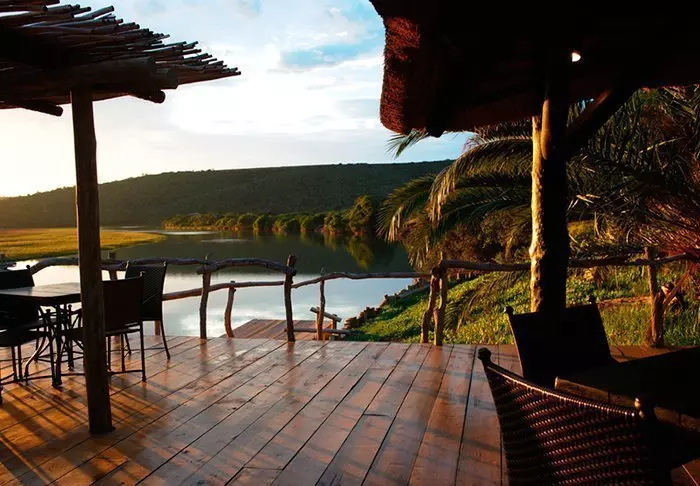 The 4-star River Lodge is located in the Kariega Game Reserve on the banks of – and almost extending into – Bushman’s River. The way that the restaurant, bar and swimming pool have been constructed almost makes you feel that you are surrounded by the still, reflective water of the river. The lodge has a unique viewing terrace built out over the river. This is the perfect place to sip a drink at sunset, or to enjoy dinner under a starry sky. Privacy is the defining feature of the lodge and its suites, making this the ideal place to enjoy some peace and quiet. The lodge comprises of ten exclusive, luxury suites with thatched roofs, laid out at intervals along the river bank. The suites are very spacious and decorated with examples of African art and crafts. Each suite has its own viewing terrace, air conditioning, ceiling fan, internet, safe and telephone, as well as a well-appointed bathroom with a bathtub.