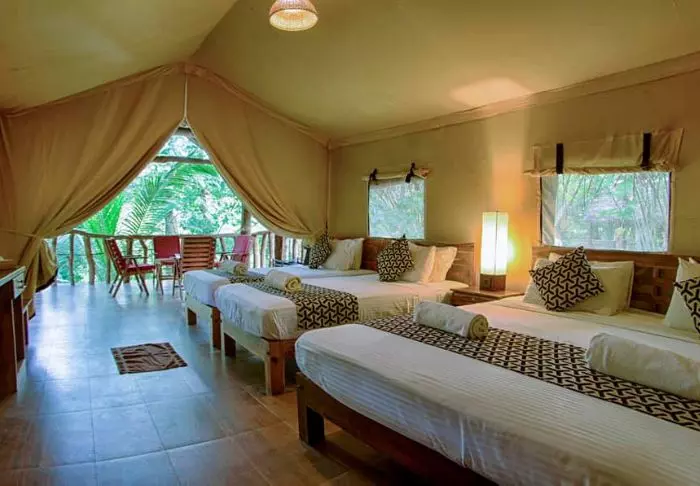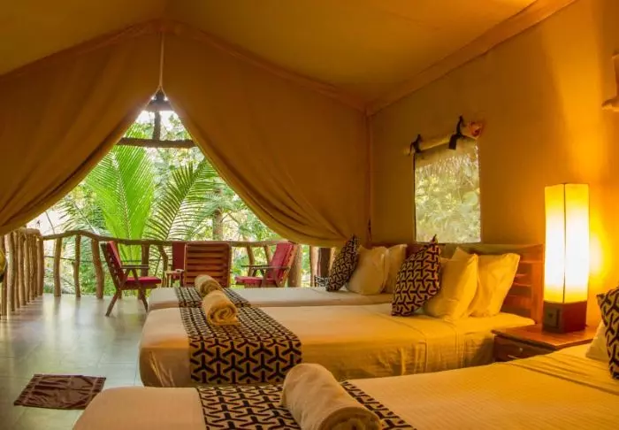 The camp consists of luxury tents made for adventure and relaxation. Located in the midst of amazing nature, you can look forward to waking up to the sound of birds chirping and the soothing trickle of the river. The tents offer proper beds and an en suite bathroom with hot and cold water. In your tent, you’ll also find complimentary bottled mineral water and an electric kettle, so you can make yourself a cup of coffee or tea, which you can enjoy on your veranda. Mosquito nets and a hair dryer can be borrowed from reception, while free Wi-Fi is available in the communal areas.