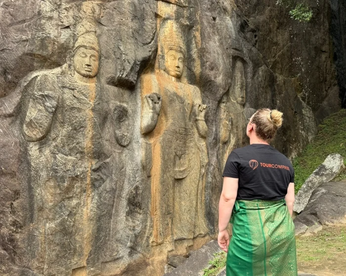 Next, your journey continues to Buduruwagala Temple, which dates all the way back to the 10th century. This temple sits quietly and serenely amidst nature, renowned for its impressive rock carvings. The Buddha statue, standing at an imposing 16 metres, rises majestically surrounded by six smaller figures. If you look closely, you can still spot traces of the vibrant colours they were once painted with. It’s a truly fascinating place, where you can almost feel the presence of history in the air.