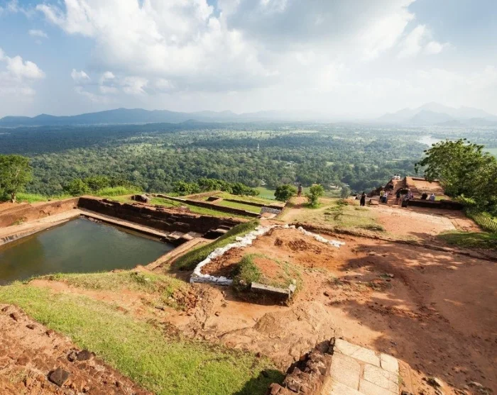 On the flat summit, an unforgettable experience awaits. Here, you can marvel at the breathtaking views over the ancient palace ruins with moats, water features, and lush gardens. A vast sea of green jungle, mountains, and villages stretches to the horizon, with Pidurangala Rock visible in the distance.