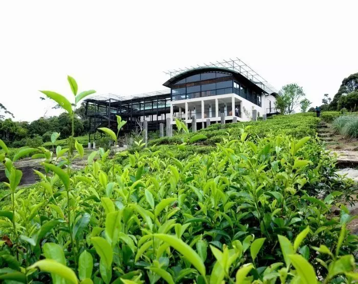 The lodge consists of 20 cabins dotted throughout the green tea plantation. All are built using recycled materials. The cabins themselves are built from old shipping containers, the walls and ceilings are built from bamboo and the terraces are built from railway sleepers.