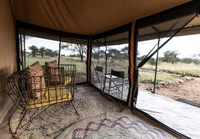 The tents are large and have plenty of space and air around the two king-size beds. From the living room, you head straight onto a large, wide-open veranda, from which you have the most amazing views of the Serengeti Plains. All tents have their own bathroom with a toilet and shower. There is also a bath tub where you can lie and soak, directly overlooking the national park. Likewise, there is a private outdoor shower, which also offers stunning views of the Serengeti Plains.
