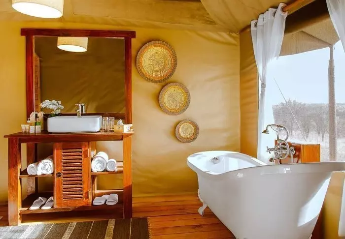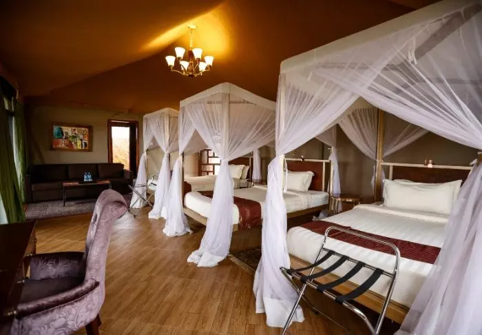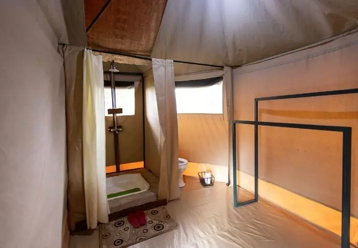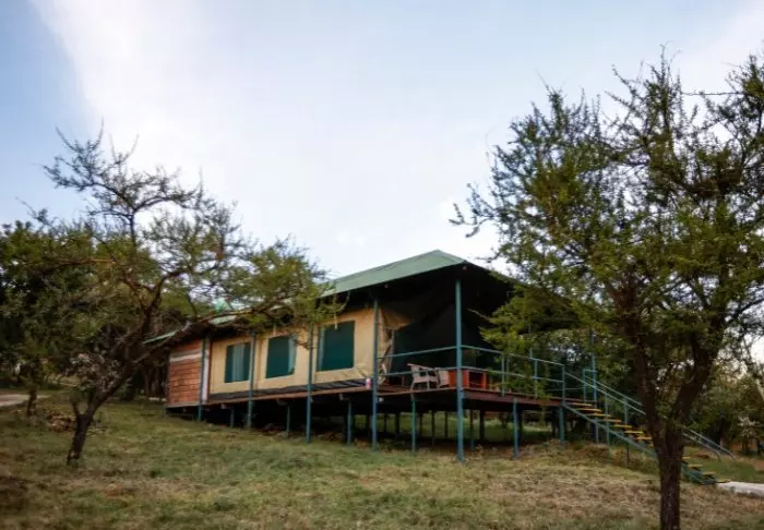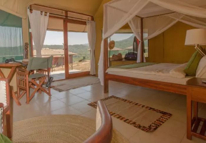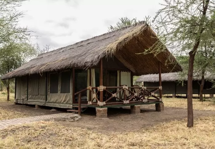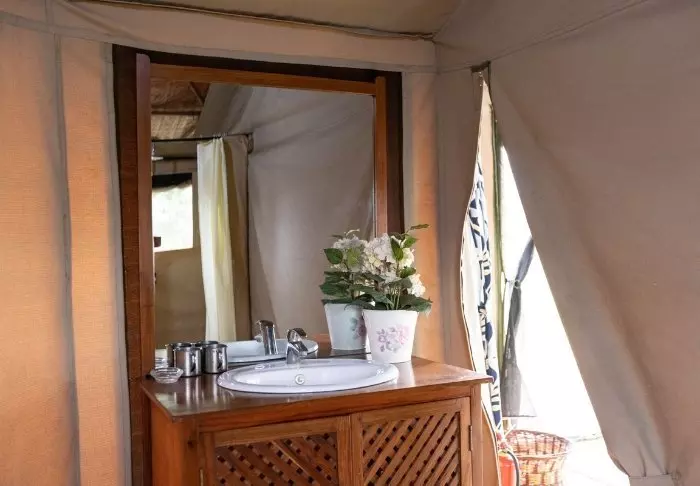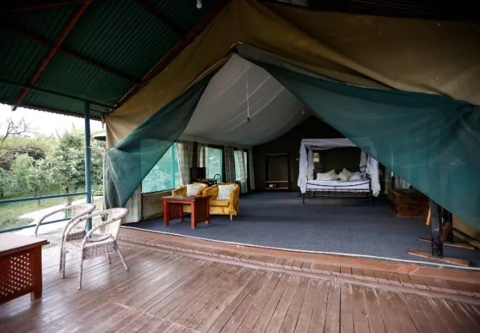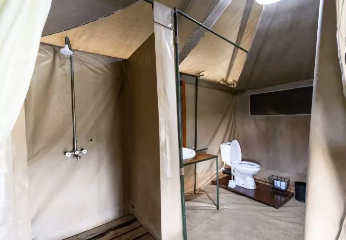 Ngorongoro Wild Camp consists of 20 large, full-height tents with a solid floor. The tents are built on poles, giving them most amazing views of the area from the terrace in front of the tent itself. All tents have their own large, tiled bathroom with running water, a toilet and a shower.