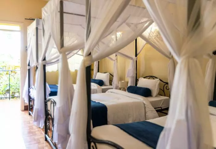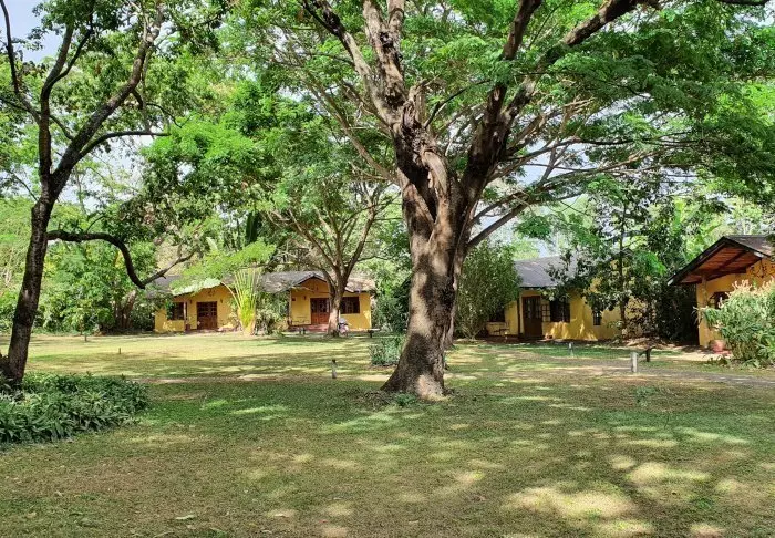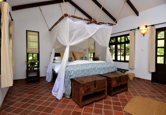 This is a small, exclusive lodge with just 24 cabins in charming colonial style and 12 rooms in the main building with a terrace or balcony, all facing out onto the garden. All rooms have a bathroom with a shower and also offer a fan, a tea/coffee tray and a mosquito net as well as the possibility of room service.