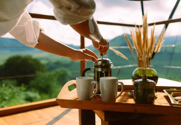 In the morning, you are served freshly made coffee on the balcony, so you can take your time to enjoy the sunrise before heading to the restaurant, where a rich breakfast is served.