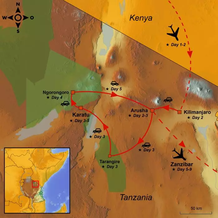You arrive at Kilimanjaro Airport in Tanzania Outside the airport, you’ll be met by one of our local guides who will drive you to your hotel just outside Arusha, where you’ll spend the night. The rest of the day is yours to do as you please: You can rest after the journey and perhaps take a dip in the hotel’s pool.