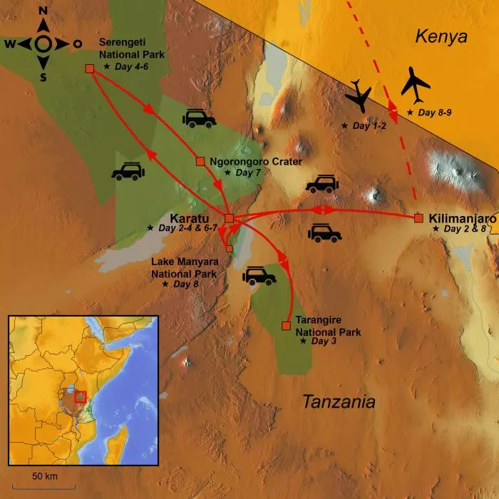 | Day 8 | Lake Manyara and to Kilimanjaro Airport is approximately | 195 |