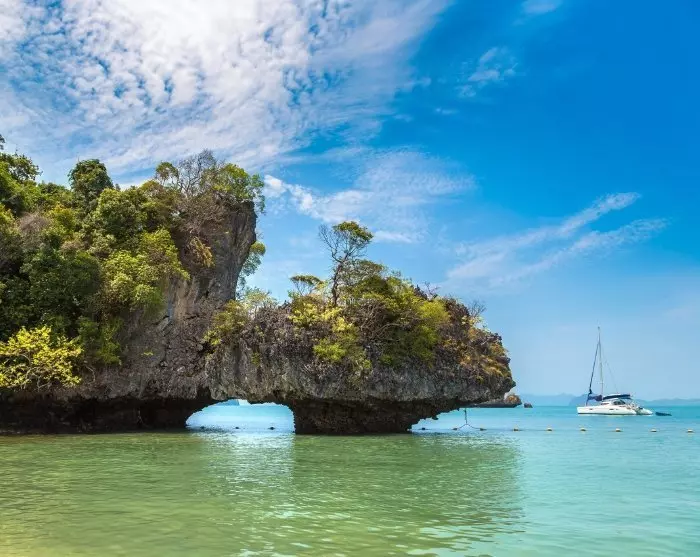 You’ll start by visiting Hong Island, situated between Krabi and the Koh Yao islands. Part of the Than Bok Khorani National Park, Hong Island is known for its breathtaking beauty. Hong Island consists of two picture-perfect beaches with fine white sand and crystal-clear waters, surrounded by dramatic limestone karsts. The rest of the island is covered in lush jungle where various species of flora and fauna thrive.