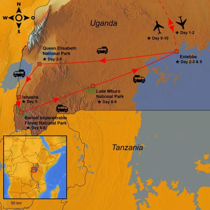 Experience the absolute highlights of Uganda; Lake Victoria, the world’s second largest freshwater lake, the Equator and the 3 national parks Queen Elizabeth, Bwindi Impenetrable and Lake Mburu.