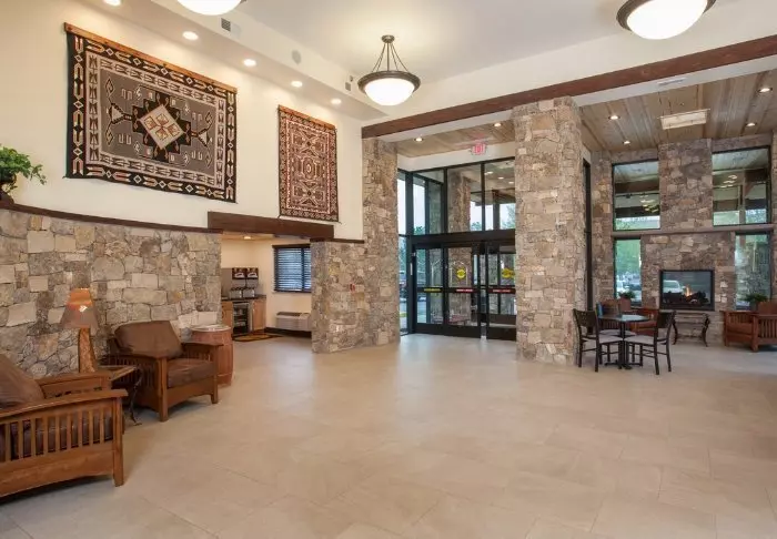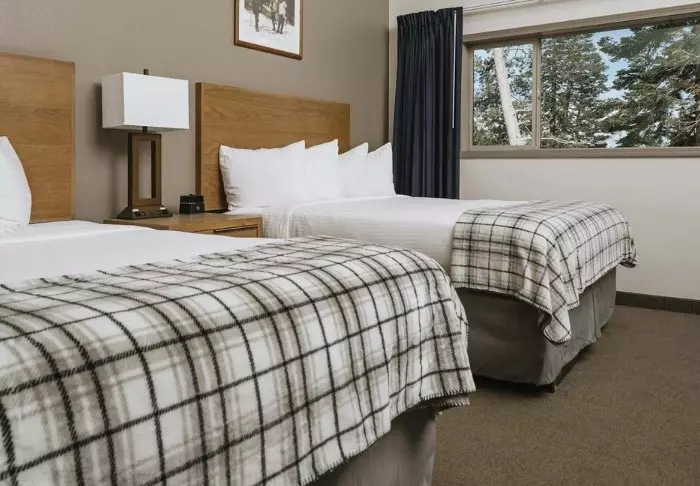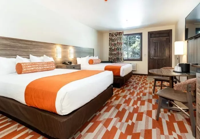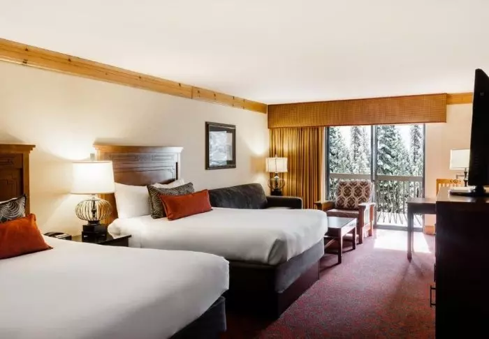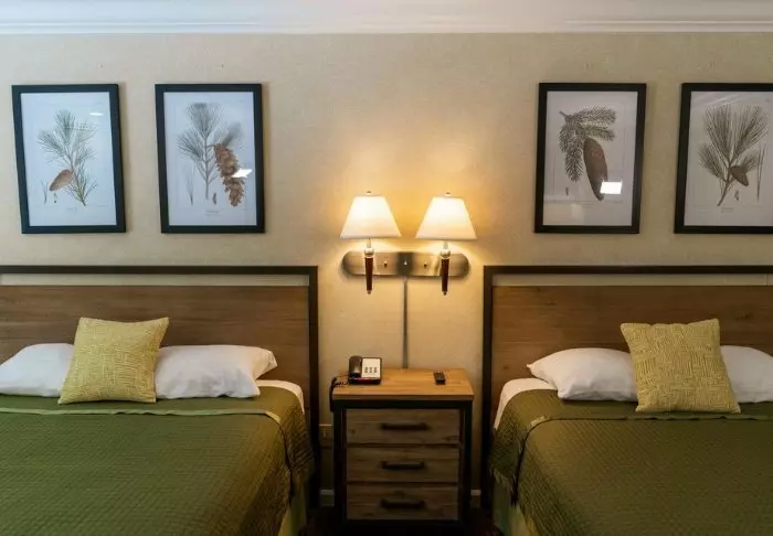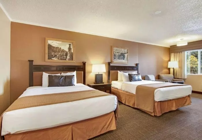 The hotel is built in typical lodge style and offers 132 rooms, renovated in 2024. The rooms are furnished in a modern style in warm and earthy shades, adding a cozy atmosphere to your stay. In addition to a desk, TV, mini-fridge and coffee machine, there is an en-suite bathroom with a hairdryer and a small selection of free toiletries. The rooms also have air conditioning and free Wi-Fi.