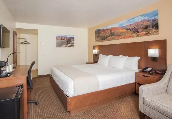 At Red Feather Lodge, you’re just a 1.7-kilometre drive from the rim of the Grand Canyon. Tusayan is a small district that offers hotels, restaurants, a shopping mall and a gas station. Right across from the hotel, you’ll find, among other things, the popular, local steakhouse, but there are also several well-known fast food chains nearby.