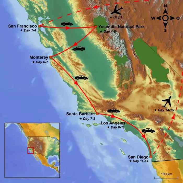 Today, it’s time to head back home. You check out of the hotel and drive to the airport in San Diego, depending on what time your flight is. On your car rental voucher, it states exactly where and when the car must be returned at the latest. The process is straightforward, and you can then take your luggage into the airport. You then fly back to Europe, with connecting flight(s) on the way.