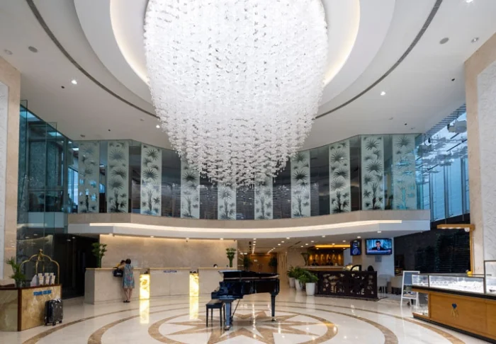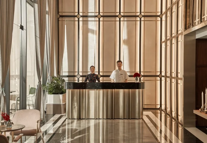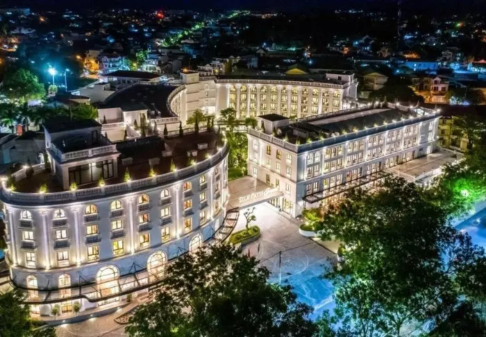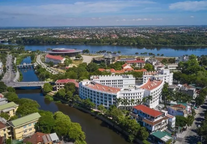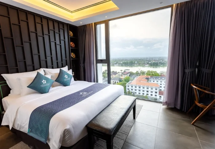 White Lotus Hué boasts a prime location in Hué’s modern quarter, just a couple of minutes’ walk from the Perfume River and within easy strolling distance of restaurants, shops, and local markets. This contemporary hotel stands tall with mountain views, making a striking contrast to the historic imperial city on the river’s far side.