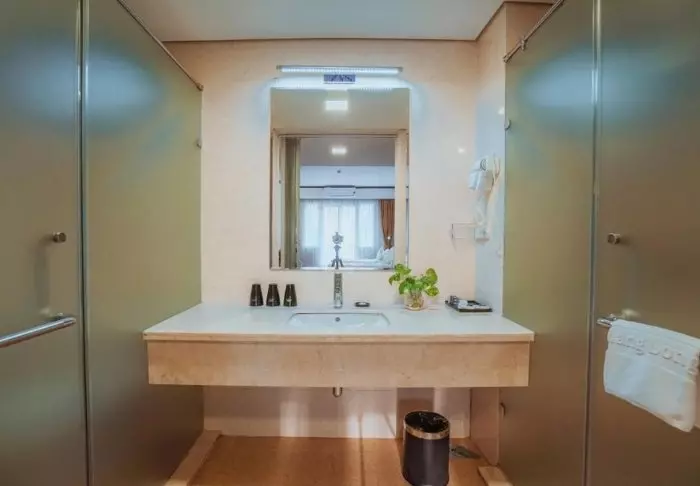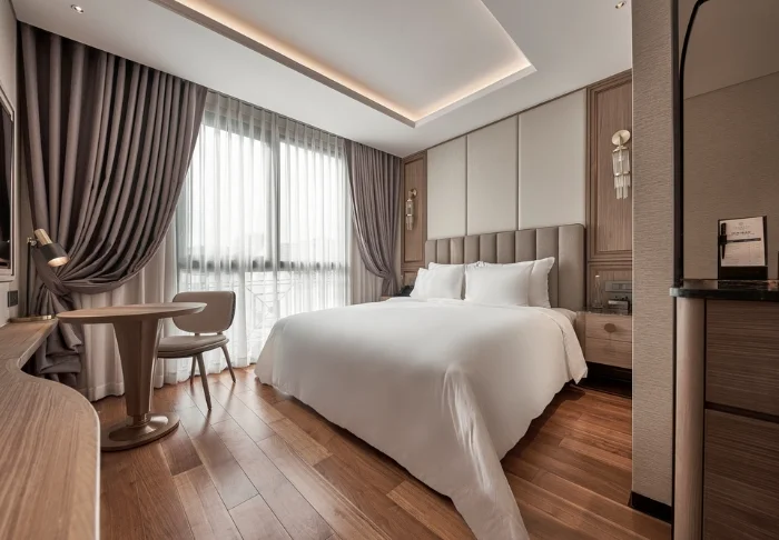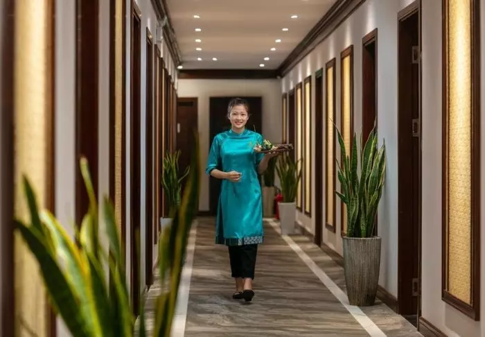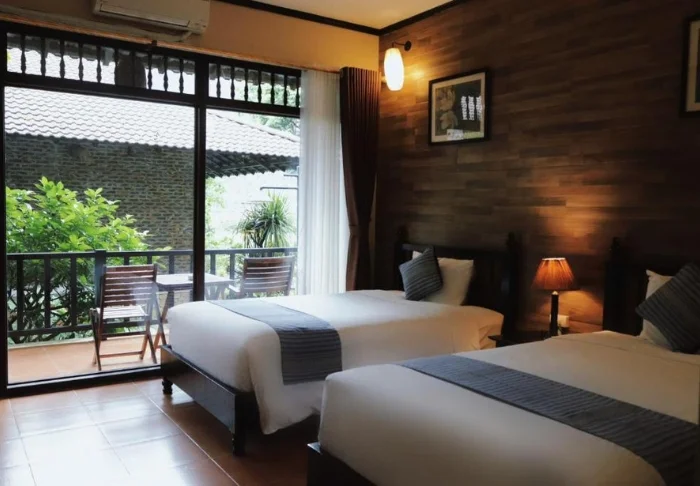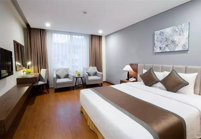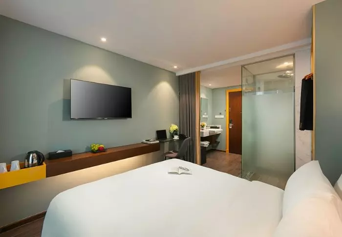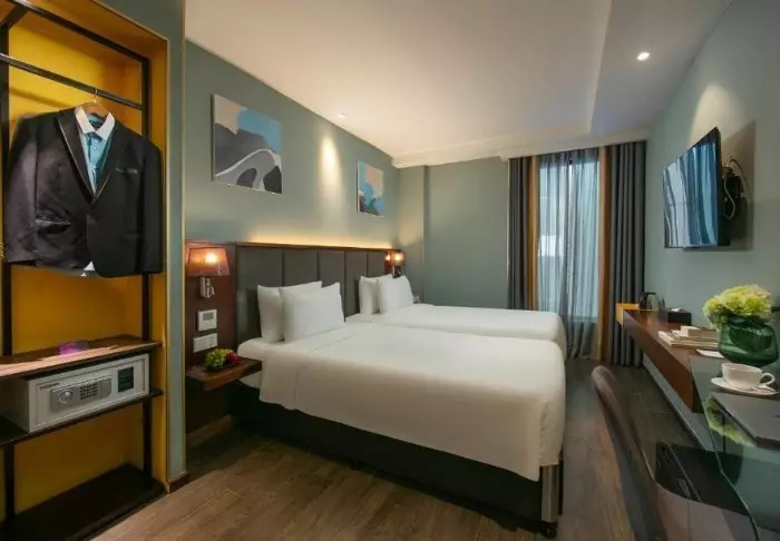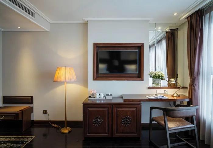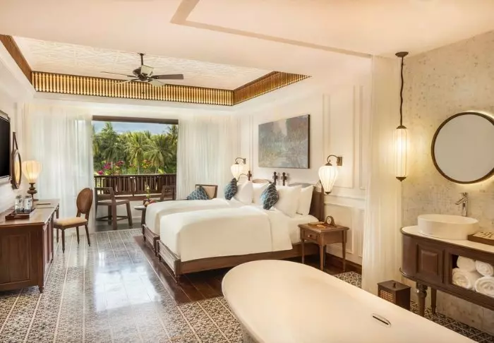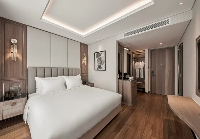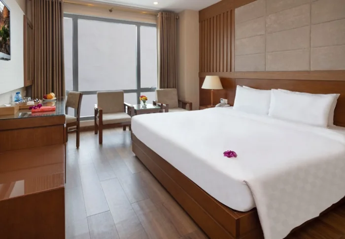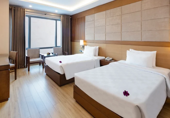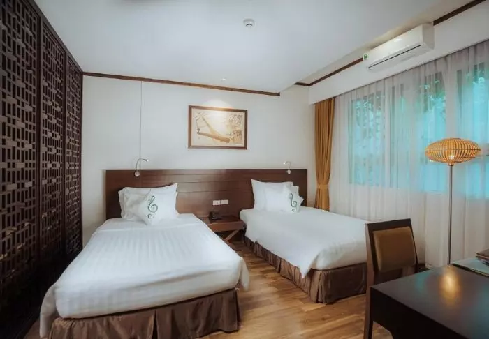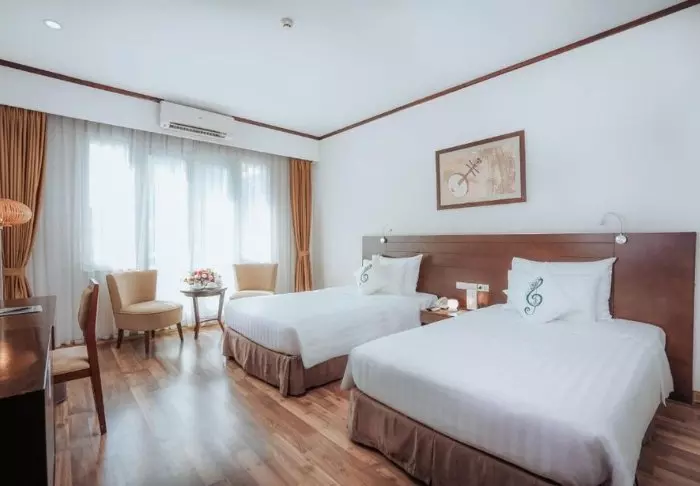 Your stay begins in a superior room, blending modern comfort with a touch of Vietnamese elegance. The rooms feature large windows letting in natural light, as well as wooden details and classic furnishings that create a warm and inviting atmosphere. Particularly striking are the wall panels adorned with blooming cherry branches, lending a local, artistic flair. All rooms are equipped with a double bed or twin beds, fridge, TV, safety box, kettle, air conditioning, and a private bathroom with toiletries and a hairdryer. Thoughtful touches throughout provide a calm retreat, making it easy to unwind after a day of exploring.