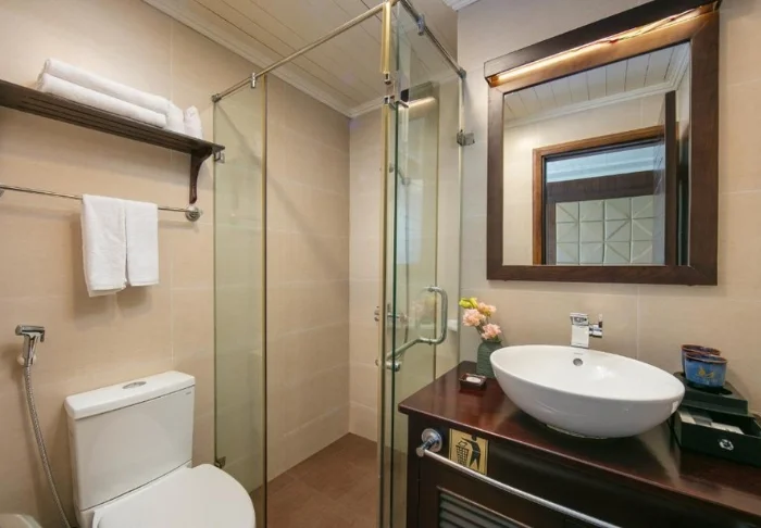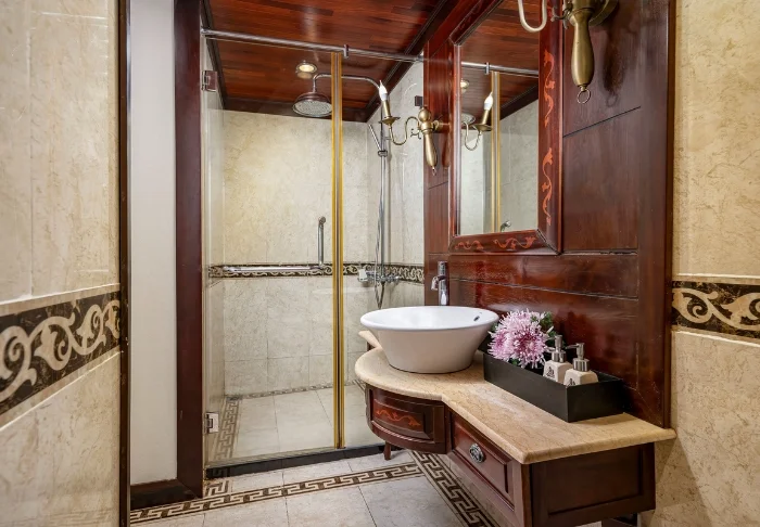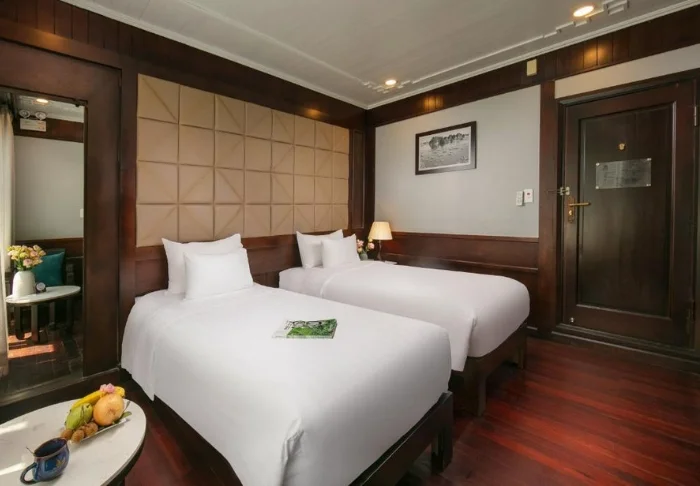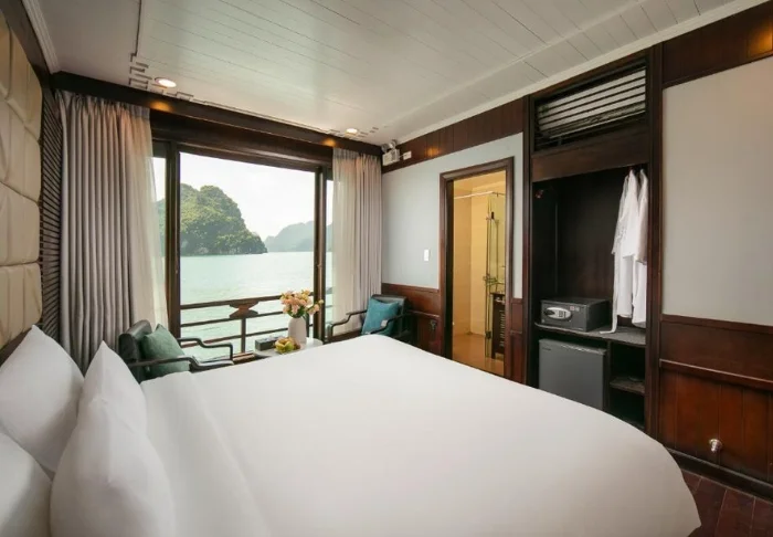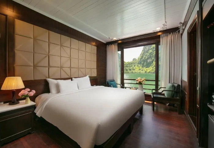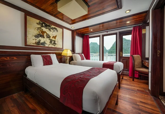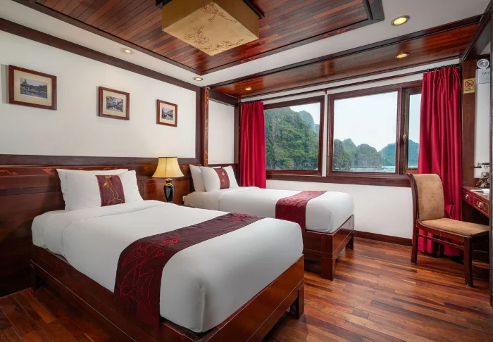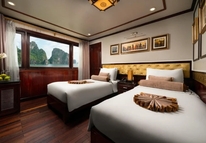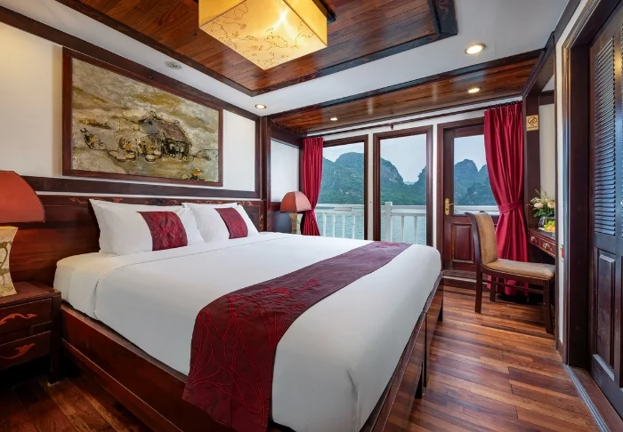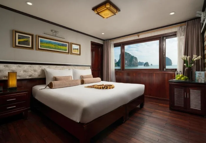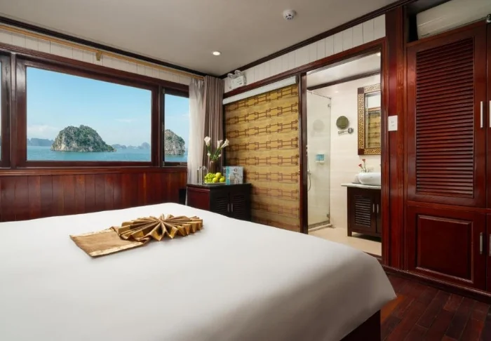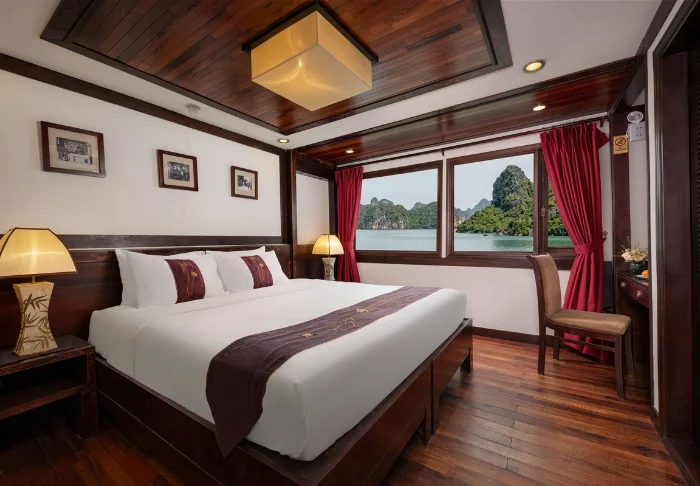 The ship features 24 cabins across two decks, each inspired by traditional Vietnamese craftsmanship and culture. Cabins are adorned with dark wood panelling, intricate décor, and large panoramic windows overlooking the bay. All are equipped with air conditioning, a minibar, a safety box, tea and coffee facilities, and a bathroom with both a bathtub and separate shower. These spacious cabins combine warm materials with modern comforts, providing an inviting retreat between each day’s adventures.