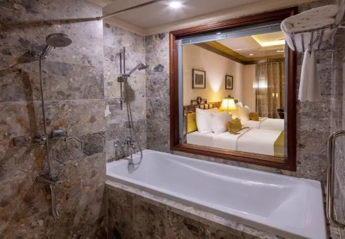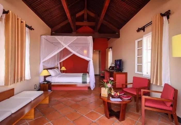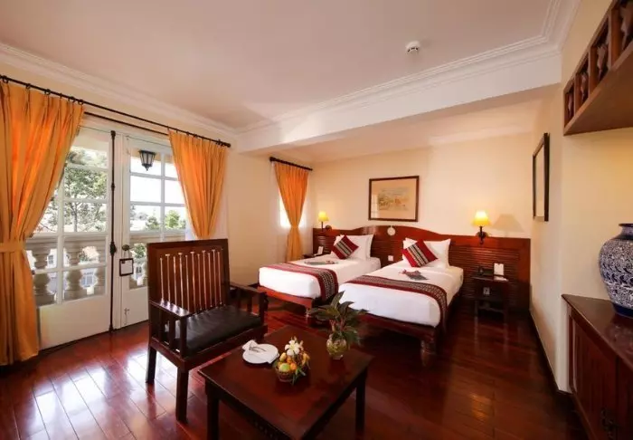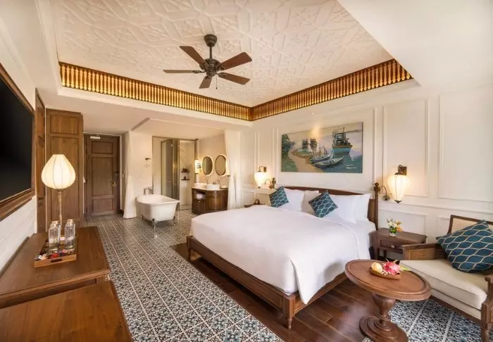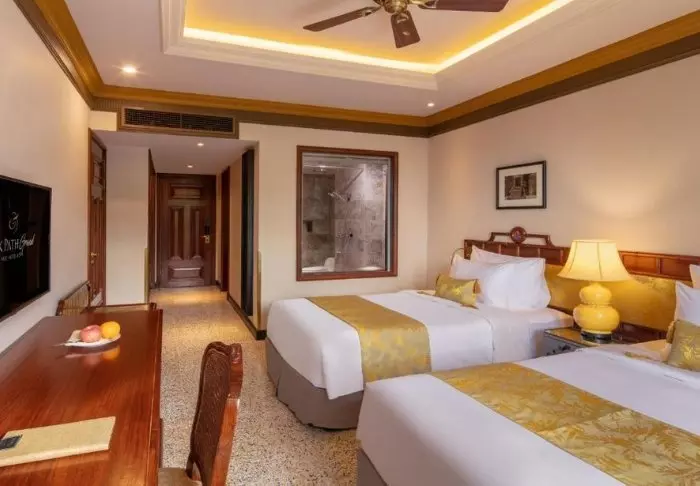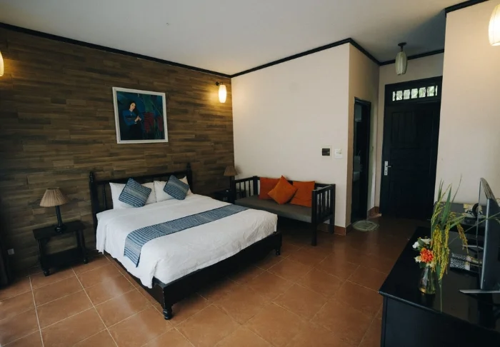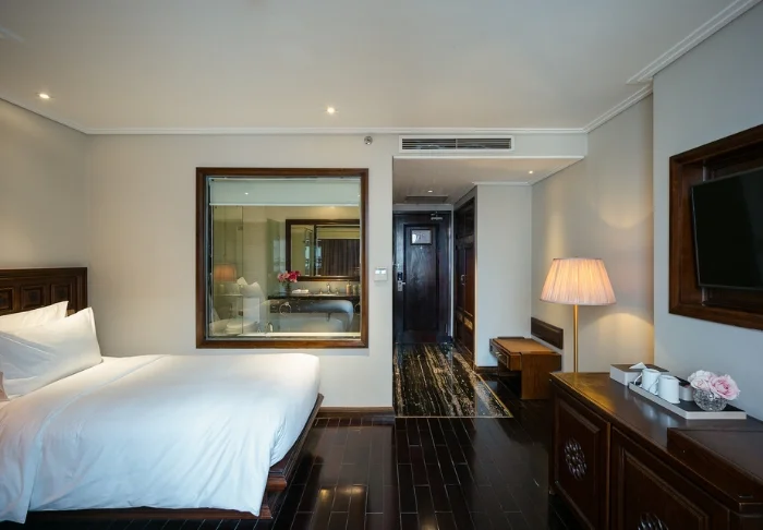 You’ll stay in a superior room, decorated in a Vietnamese style with dark wood furnishings that create a warm and inviting atmosphere. The rooms come equipped with modern conveniences such as air conditioning, Wi-Fi, a minibar, tea and coffee-making facilities, a safety box, and a flat-screen TV, offering everything you need for a comfortable stay. The bathroom features a shower, bathrobe, hairdryer, and toiletries.