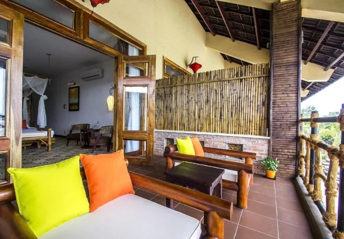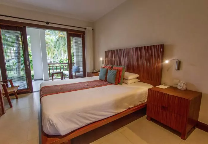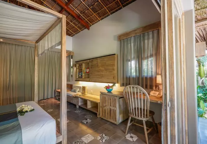 The Garden View rooms are situated in cosy pavilions nestled amidst the vibrant gardens. They are bright and furnished with bamboo furniture, mosquito nets draped over the beds, and colourful cushions that create a warm and inviting atmosphere. Large windows let the outdoors in, and from your private terrace, you can soak up the peace and admire the lush surroundings.