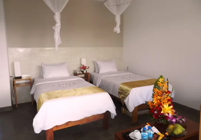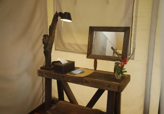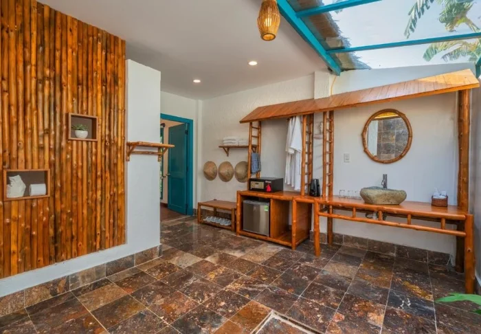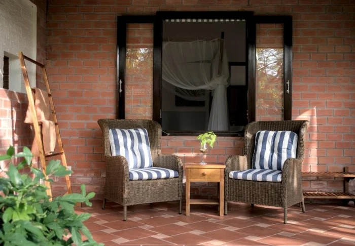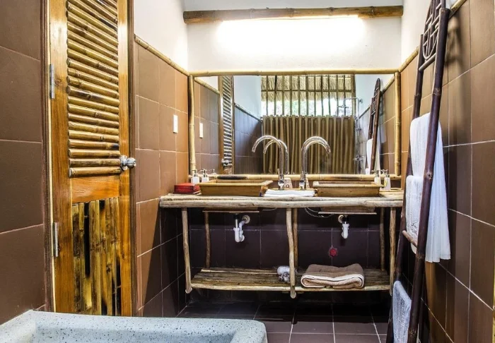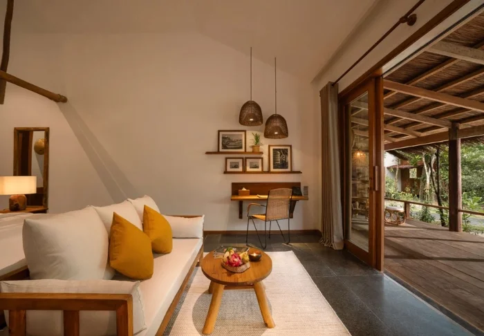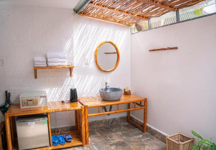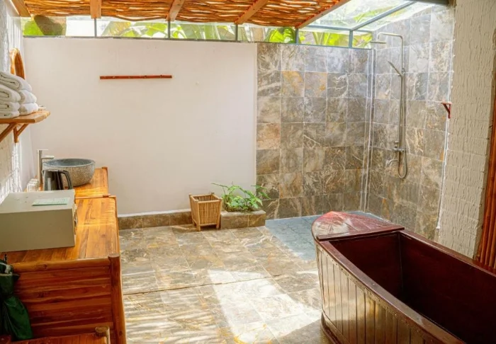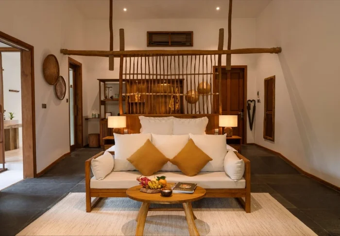 The lodge features charming bungalows built from natural materials, blending seamlessly into their tranquil surroundings. You’ll stay in a deluxe room set amidst the lodge’s flourishing gardens filled with blossoming plants and fruit trees. The room is approximately 40 m² and furnished with handmade pieces crafted from natural materials, creating a calm and authentic atmosphere. Here, you’ll find either a double bed or two single beds, air conditioning, a minibar, Wi-Fi, and a kettle so you can make tea or coffee. The spacious bathroom is fitted with modern amenities and features either an outdoor or indoor shower. From your private terrace, you can soak up the peaceful garden views and the serene atmosphere.