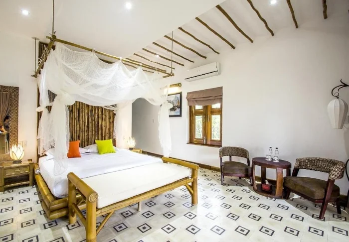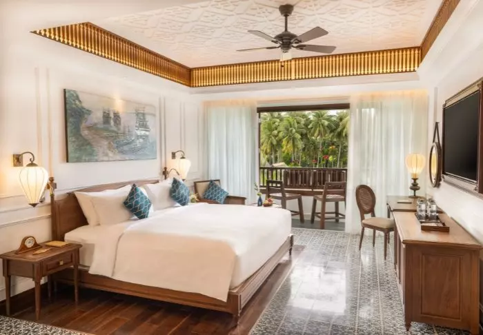 The hotel is built in a modern Vietnamese colonial style and offers just 37 rooms, ensuring an intimate and relaxed atmosphere. You’ll stay in a superior room as standard, which is bright and tastefully furnished with wooden décor, large windows, and subtle details inspired by Hoi An’s distinctive aesthetic. Your room will include air conditioning, Wi-Fi, a minibar, a kettle, a safety box, and a TV. The bathroom is equipped with a rainfall shower and complimentary toiletries.