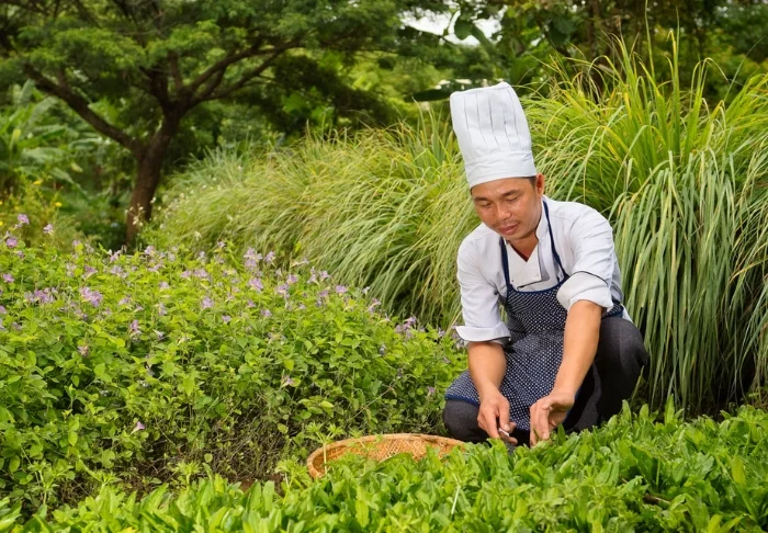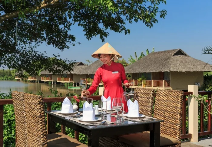 The restaurant menu showcases local ingredients from the region, offering classic Vietnamese dishes featuring fresh herbs, fish, and fruit from the delta. Many of the ingredients are picked straight from the hotel’s own garden, and you can savour your meal while gazing out over the river as the sun gently sets behind the palms.