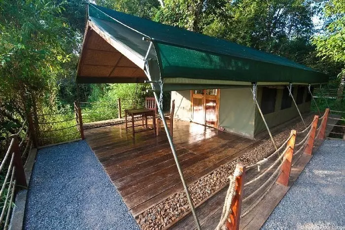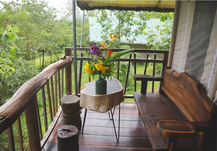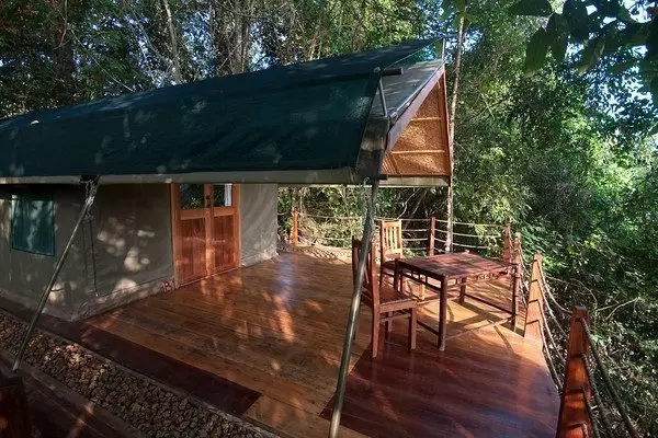 Accommodation is in luxury tents specially designed for tropical conditions. The tents are raised above the ground on a wooden platform and command an excellent view of the Ben Cu rapids. The tents are linked to the main building at the lodge by a network of walkways. All tents are equipped with either one double bed or two singles and have their own bathroom, air conditioning, a fan and a minibar. In front of each tent there is a charming balcony furnished with a couple of chairs – perfect for admiring the sunrise over the river and listening to the call of the gibbons.