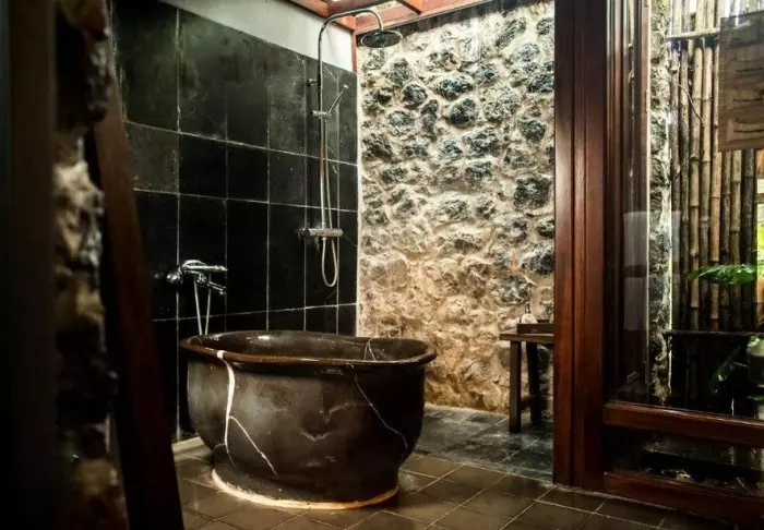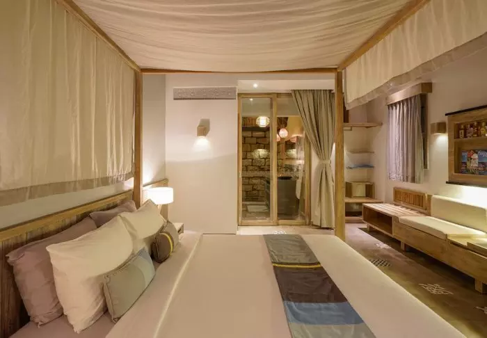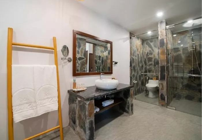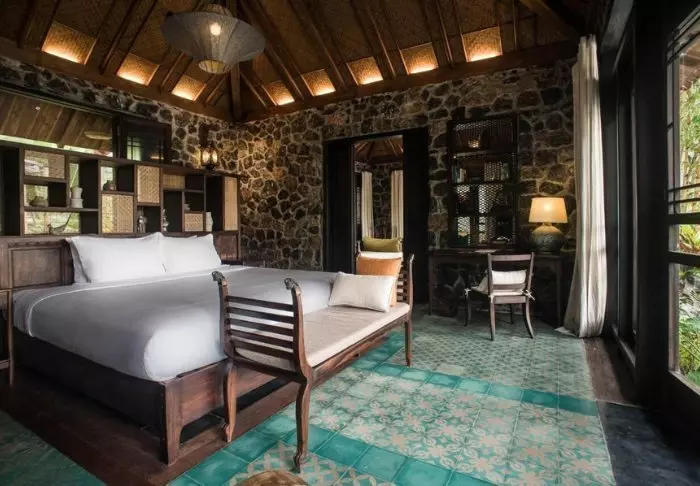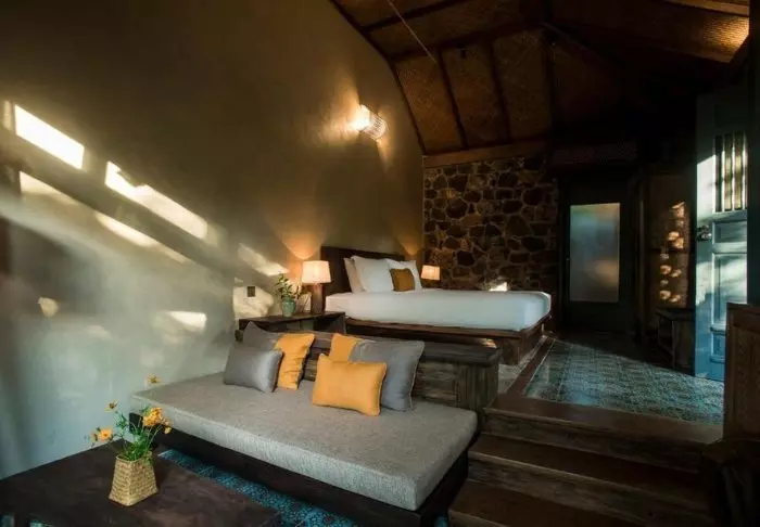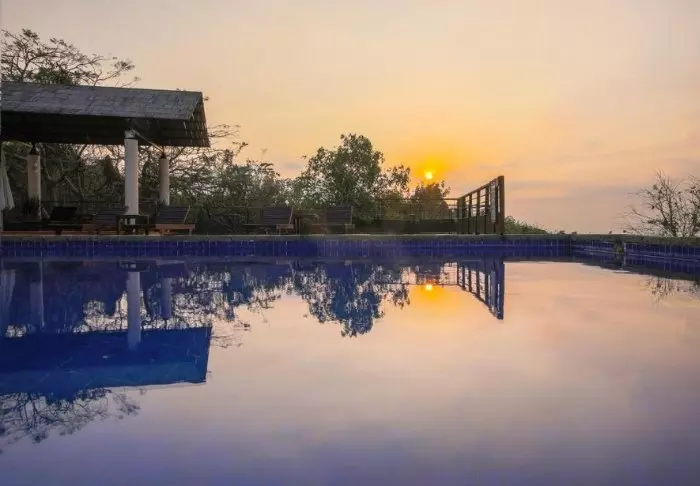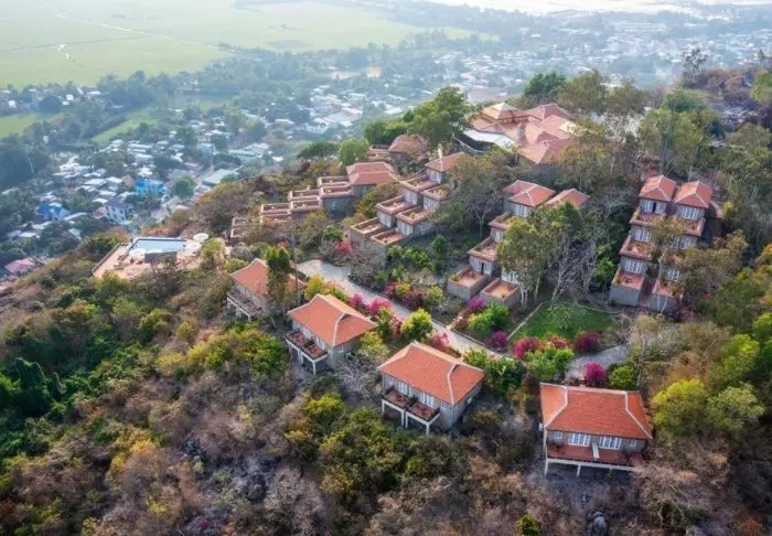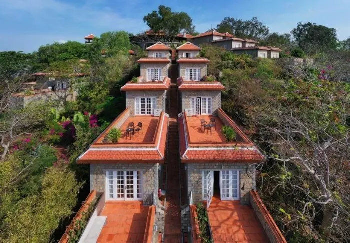 Here there are 26 bungalows. They are built from stone, allowing them to almost naturally blend in with their mountainside surroundings. All rooms are modern and feature minimalist interiors, making particular use of stone and wood in their decoration. The colours are muted to fit the contrasts found outside the windows. All rooms feature their own bath and toilet, TV, mini bar, hair dryer, tea/coffee facilities and terrace access. Both sunrise and sunset are magical experiences from the hotel. The lodge has a pool and its own restaurant.