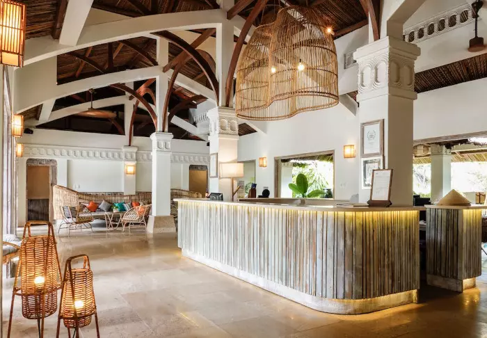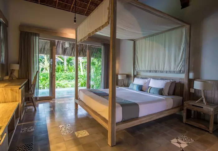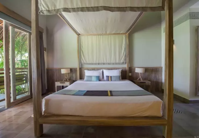 You’ll stay in a Garden Cottage, accessible via meandering paths through the hotel’s lush, palm-shaded gardens blanketed in blooms. From your terrace, you’ll overlook your own little garden—if you’re lucky, you might spot ripening passion fruit, or bright orchids and hibiscus. The room itself is simply styled, with stone floors and large windows that flood the space with natural light. You’ll also have a four-poster bed with a mosquito net, air conditioning and a ceiling fan, Wi-Fi, a minibar, tea and coffee facilities, a safety box, and a bathroom with a rainfall shower, hairdryer, and toiletries—everything you need for a truly relaxing stay.
