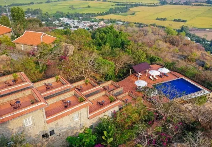 Some distance up the side of Sam Mountain is the hotel Victoria Nui Sam Lodge. Its location guarantees the very best view of the Mekong Delta, with its green rice paddies, canals, as well as the mountains in the background by the Cambodian border.