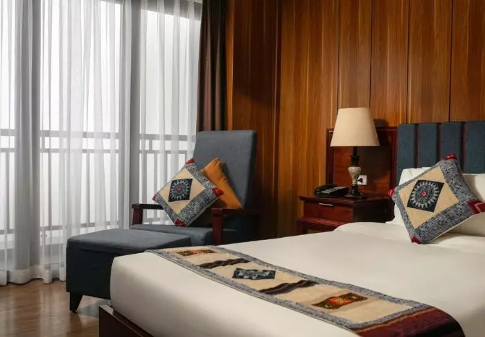 The hotel’s 104 rooms are spacious and elegantly appointed in traditional Vietnamese style with dark wooden furniture. They offer everything you need for a comfortable stay including Wi-Fi, air conditioning, a safe, a TV and seating area. The bathroom has a shower and offers complimentary toiletries, a hair dryer, a bathrobe and slippers. Most rooms also have large windows that afford poetic views over Sapa’s landscapes.