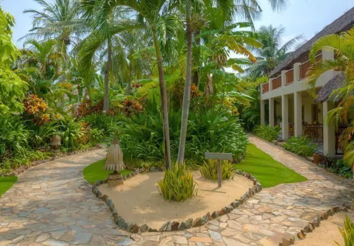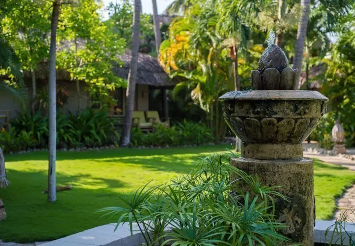 The resort’s 30 rooms are located in bungalows spread throughout the lush garden, with its rippling water, colourful flowers and small shady corners where you can laze.