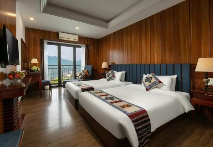 The hotel has 103 rooms, all of which overlook Ham Rong Mountain and Sapa Lake. They are modernly appointed in calm colours and offer air conditioning, a TV, Wi-Fi, a safe, a minibar, a dressing table/desk and a kettle for tea and coffee.