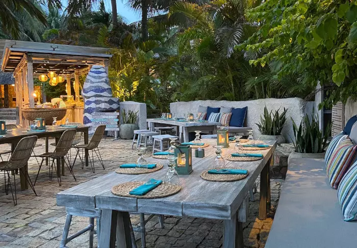 All of the resort’s 19 bungalows are divided into two luxurious, spacious rooms and have an en-suite bathroom and terrace overlooking the garden. The rooms are tastefully decorated using local woods, stone, ceramic and tiles with traditional patterns, giving them a refined charm.