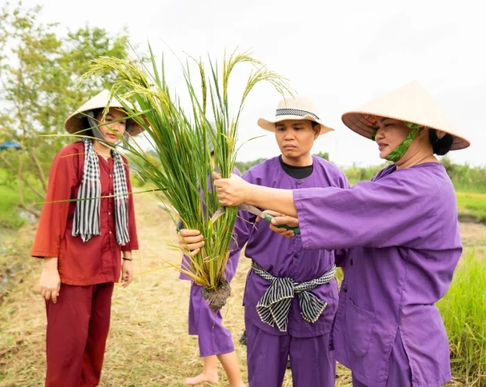 Your tour then takes you to our social sustainability project in Vinh Long, established by our local partner. Here, a peaceful walk through the village awaits, with your guide offering insights into the project as you go. You’ll also have the opportunity to experience traditional rural life firsthand. Together with local farmers, you’ll get involved in rice cultivation – either planting young seedlings or helping with the harvest, depending on the season. This hands-on and enlightening activity provides a unique glimpse into daily life in rural Vietnam and the dedication that drives sustainable farming. By taking part in this tour, you’ll also be supporting families in Vinh Long, as a percentage of the tour price goes directly towards the project, which you can learn more about here.