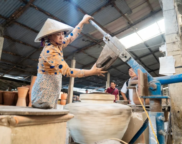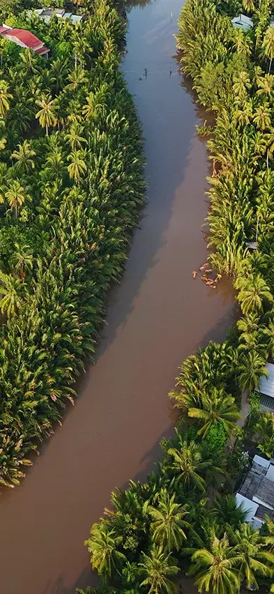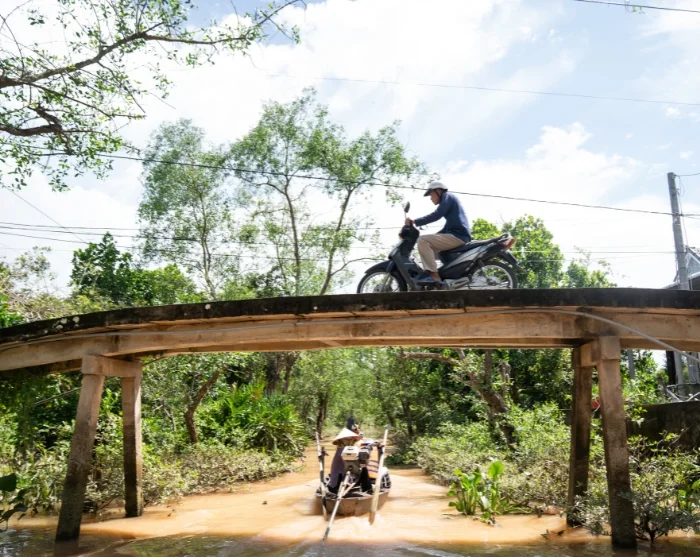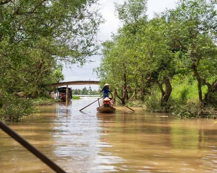After around 2.5 hours on the road, you’ll reach the town of Cai Be. Here, you’ll board a boat to begin your journey into the lush Mekong Delta. You’ll visit local workshops where skilled artisans craft products from coconut. Your journey continues aboard a small sampan—a traditional, hand-rowed wooden boat—taking you through the Mekong Delta’s narrow, winding channels.