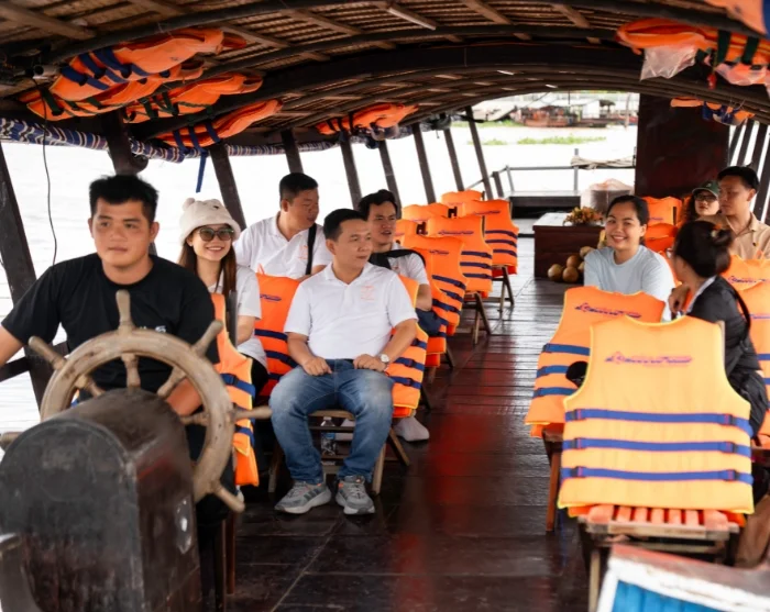 Your boat journey continues to a tranquil island in the heart of the Mekong River, where you’ll savour a Vietnamese lunch prepared with fresh, local ingredients, surrounded by lush greenery and the gentle rhythm of the river’s life.