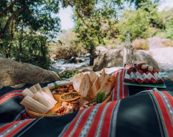 Next, set off on an adventurous walk to Bim Bip Waterfall, taking in the stunning natural scenery along the way. Upon arrival, a picnic lunch of traditional dishes wrapped in banana leaves awaits – and if you fancy, there’s the chance for a refreshing dip in the waterfall’s natural pool.