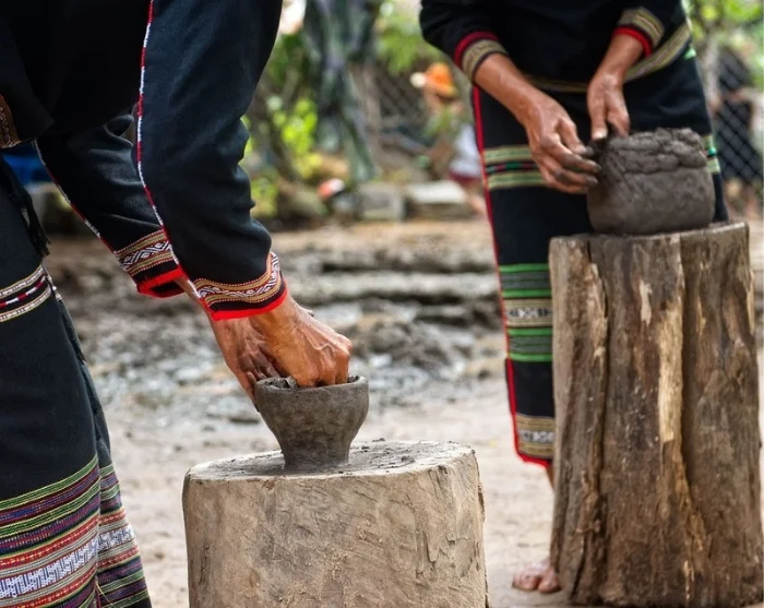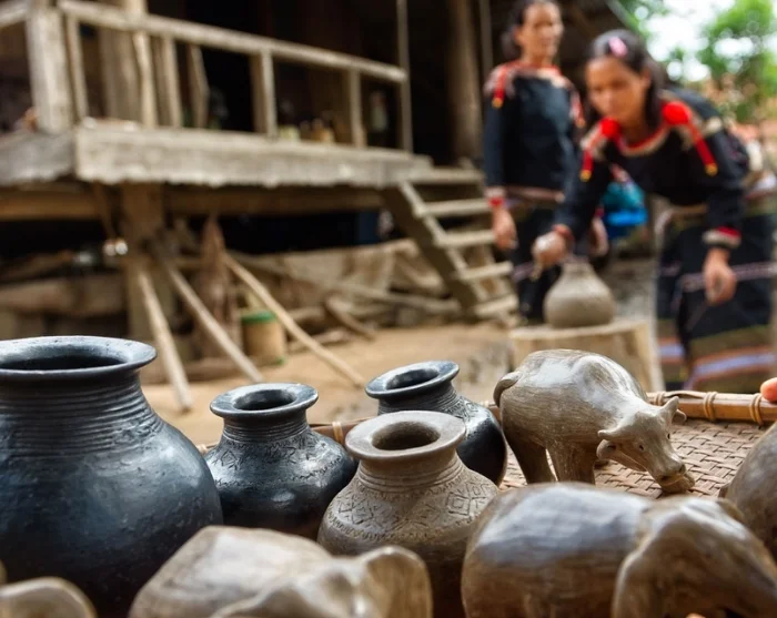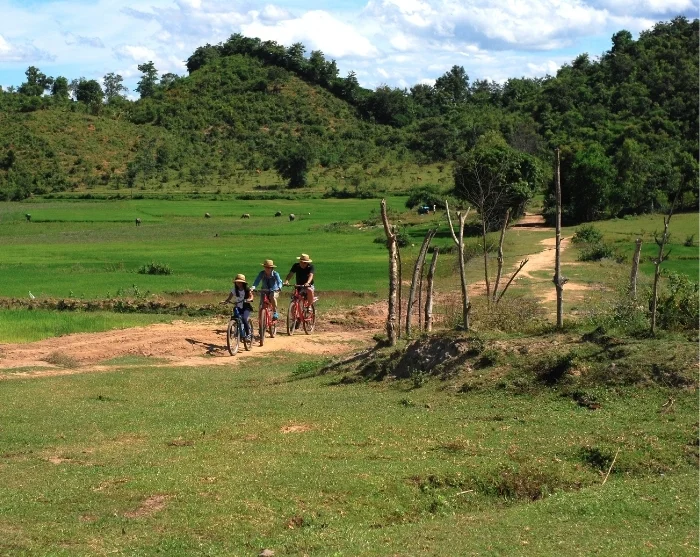After breakfast, you’ll cycle to Yang Tao village, about 12 km from Lak Tented Camp. Your journey will take you through lush green rice fields, where you may spot herds of buffalo and cattle along the way. In the village, you’ll discover the intricate craftsmanship behind traditional M’nong pottery and visit cocoa plantations, where you’ll have the chance to sample a unique, fermented cocoa wine.