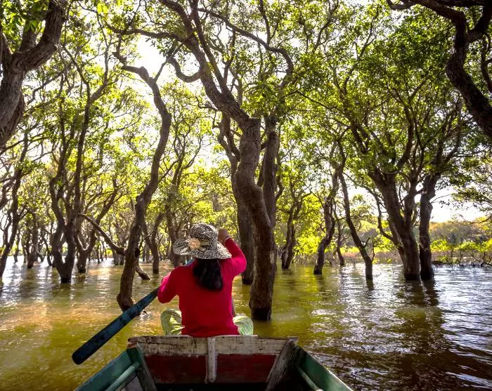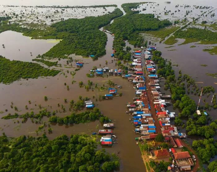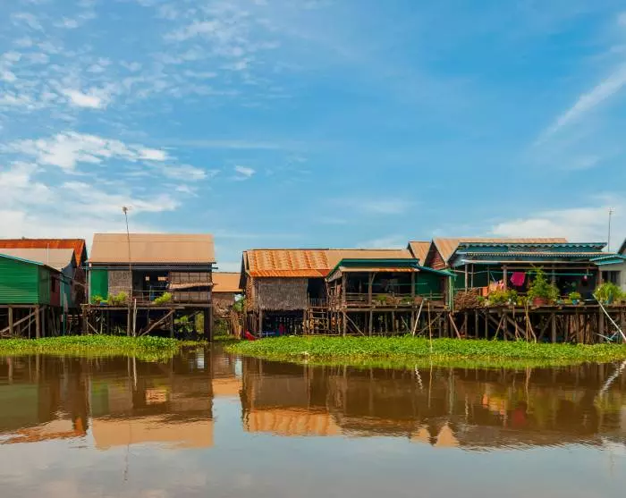 You arrive on the shores of Tonlé Sap and board a boat that will take you to one of the lake’s floating villages. Here, you are able to see close-hand how life unfolds for many of the families who primarily make a living from fishing. The families live along the lakeshore in colourful houses that stand on long stilts so that they can cope with the high water levels during the rainy season (August to early February), when the village’s narrow streets are transformed into small canals. In the dry season (mid-February to July) with lower water levels, it is easy to see the tall stilts.