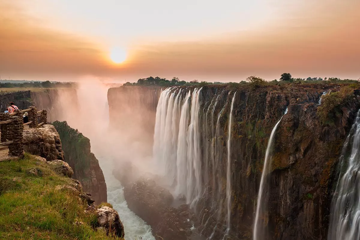 The waterfall extends over an area of 1.7 km, and every second, more than 1,000 cubic metres of water crash down into the ravines some 100 metres below. And it is no exaggeration to say that the water spray also rises hundreds of metres into the air above the falls. It looks like a lot like smoke, hence the nickname given to it by the locals “Mosi-oa-Tunya”, which means “the smoke that thunders”.