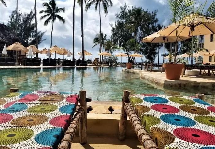 There are 96 rooms, all of which have mosquito nets, air conditioning, a safe, a terrace and free Wi-Fi. They are decorated in traditional Zanzibar style with colourful cushions and local art on the walls.